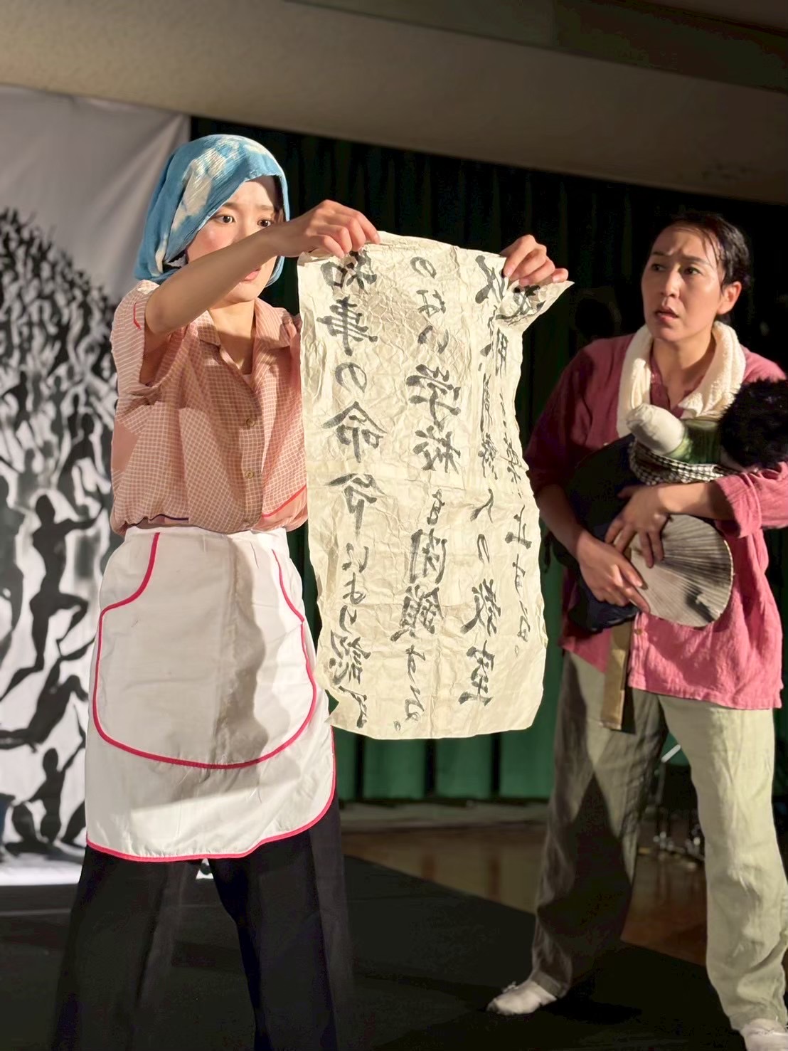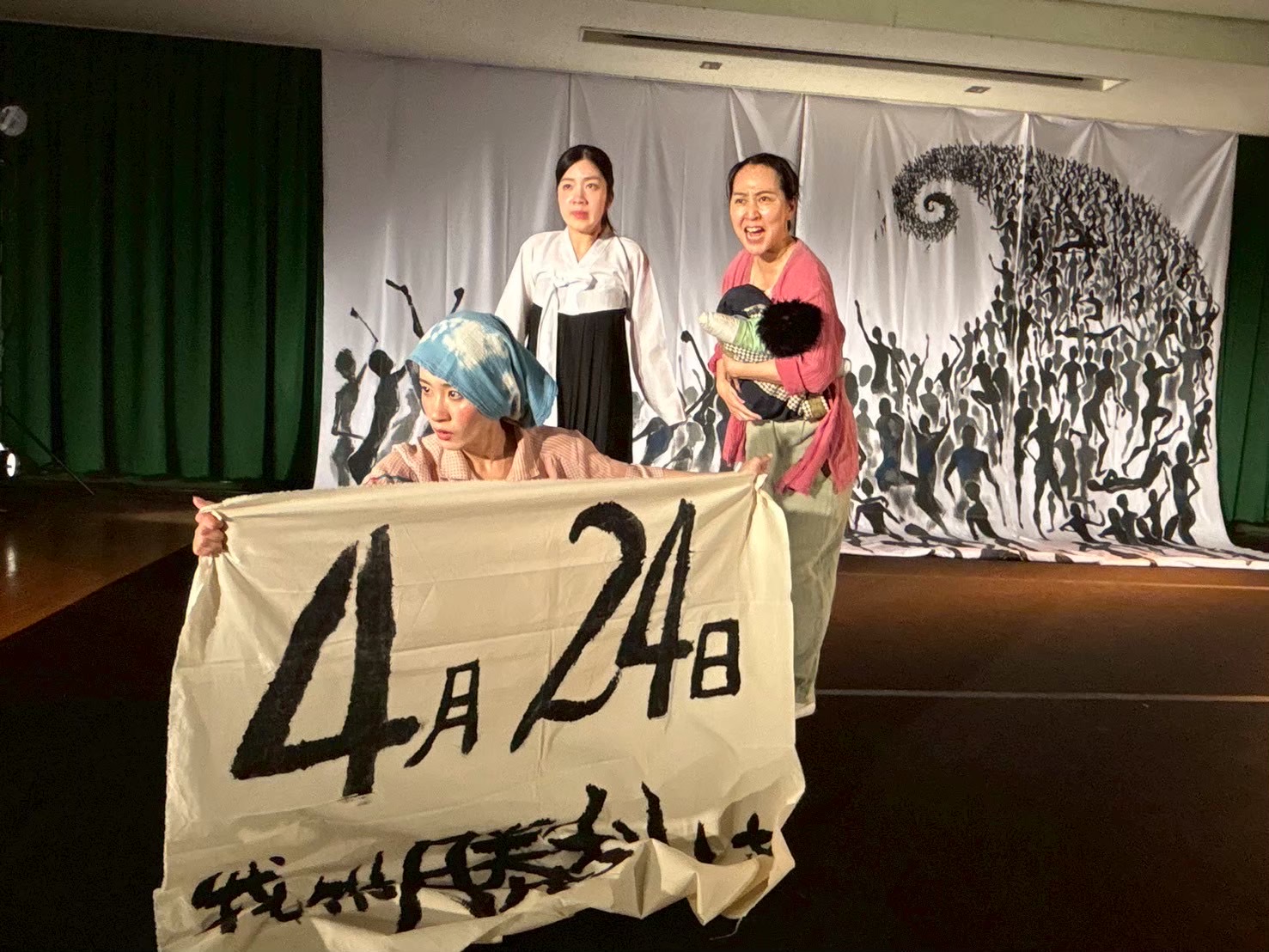- ・四、二四のこと、日本人の多くは知りません。職場でも、知る人はいません。言葉を初めとして、文化を奪われたことのない日本人に「四、二四を忘れない」という思いを理解させることは本当に難しいと思います。今日のこのお芝居はその意味では五感に訴えて感じさせる素晴らしい作品だと思います。出演者の方々の熱演、スタッフの方々の裏方の支えに感服しました。技術面ではもう少しおさえた演技をしてもと思います。そうすることでクライマックスの効果がより鮮明になると思います。心に残った場面、どぶろく作り、踊り、デモンストレーションなどなど 沢山。有難うございました。